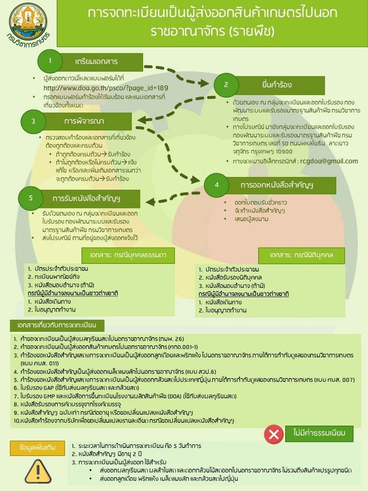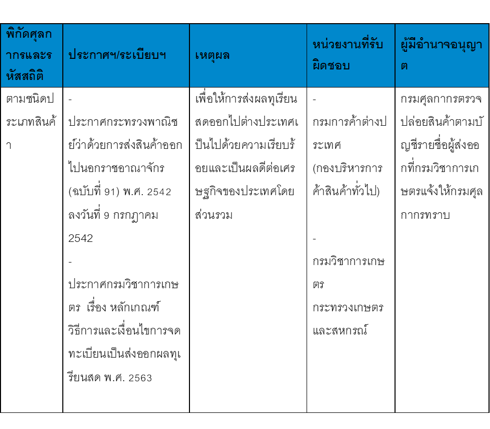 - ผู้ส่งทุเรียนสดออกไปนอกราชอาณาจักรจะต้องเป็นผู้ที่ได้จดทะเบียนเป็นผู้ส่งทุเรียนสดออกไปนอกราชอาณาจักรไว้ต่อกรมวิชาการเกษตร กระทรวงเกษตรและสหกรณ์ ตามหลักเกณฑ์ เงื่อนไข และวิธีการที่กรมวิชาการเกษตรกำหนด และกรมวิชาการเกษตรแจ้งบัญชีรายชื่อและหมายเลขทะเบียนผู้ส่งออกทุเรียนสดให้กรมศุลกากรทราบเพื่อประกอบการส่งออก