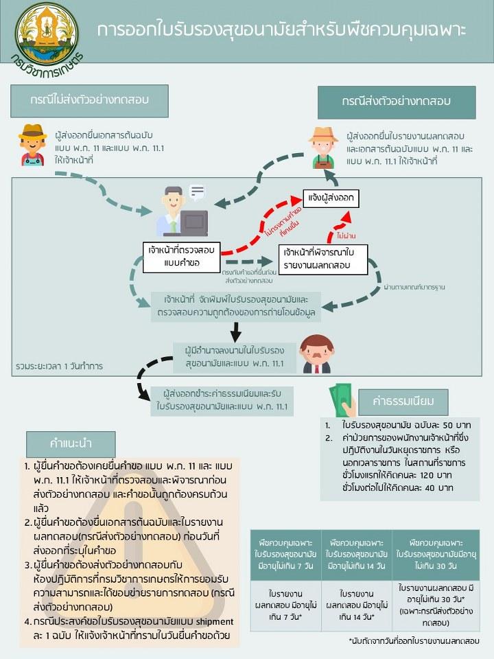และต้องปราศจากแมลงวันผลไม้ ไม่มีกิ่ง ก้าน ใบและดิน และต้องไม่พบสาร Methamidophos ในผลไม้ที่ส่งออก ส่วนลำไยที่ส่งออกมีข้อกำหนดในการใช้สารซัลเฟอร์ไดออกไซด์ (SO2) ต้องไม่เกิน 50 PPM. ที่เนื้อลำไย ลิ้นจี่ต้องมีก้านยาวไม่เกิน 15 ซม. ภาชนะบรรจุต้องใหม่ สะอาด และระบุข้อความตามที่กำหนด