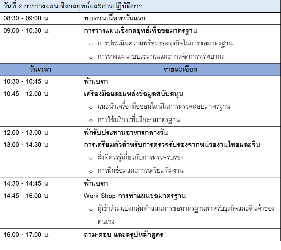 - เพื่อให้ความรู้เกี่ยวกับมาตรฐานและการรับรองที่จำเป็นในการเข้าสู่ตลาดจีน
